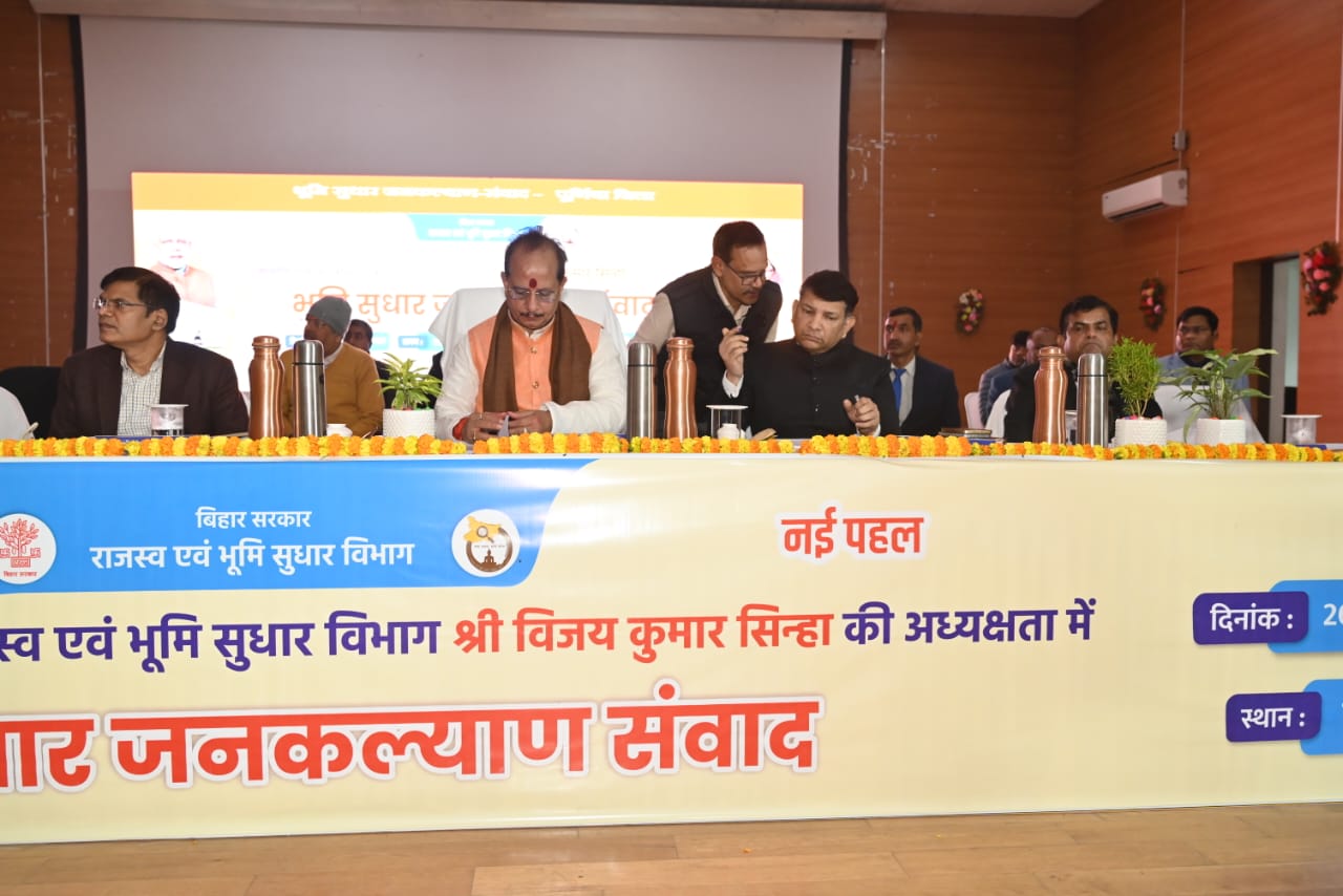 उपमुख्यमंत्री सह मंत्री, राजस्व एवं भूमि सुधार विभाग विजय कुमार सिन्हा की उपस्थिति में प्रेक्षागृह सह आर्ट गैलरी में आयोजित भूमि सुधार जन कल्याण संवाद में 2100 आवेदन आए हैं। सभी आवेदनों पर कार्रवाई सुनिश्चित की जाएगी। आमलोगों से मिले आवेदनों को कंप्यूटर पर अपलोड कर सभी पीड़ितों के मोबाइल पर क्रमवार कार्रवाई की सूचना दी जाएगी। उपमुख्यमंत्री सिन्हा ने कहा है कि संवाद में उदाहरण के तौर पर अंचलवार दो–दो, तीन–तीन शिकायतों को उठाया गया है और अधिकारियों के समक्ष उनकी परेशानी सुनी गई है। बाकी मिले सभी आवेदनों पर भी गंभीरता से कार्रवाई होगी और रजिस्ट्रेशन के दौरान दिए गए मोबाइल नंबर पर सूचना भेजी जाएगी। यहां मिले सभी मामलों की 14 जनवरी के बाद फिर से समीक्षा भी की जाएगी। शिकायत लेकर आनेवाले लोगों को धैर्य रखना है। डबल इंजन की सरकार का लक्ष्य लोगों की परेशानियों को दूर करना है। इसीलिए ठंड के बावजूद राजस्व विभाग की टीम प्रधान सचिव सीके अनिल के नेतृत्व में मुस्तैद है।
